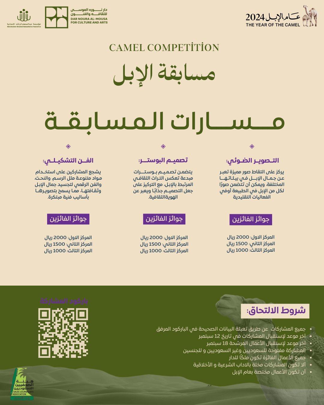 31 Aug نطلق لكم برعاية دار نورة الموسى للثقافة والفنون و مؤسسة عبدالمنعم الراشد الإنسانية "مسابقة الإبـــل" تزامناً مع عام الإبل 2024 المزيد
